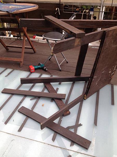 經過一年半的使用,牛仔布旗已經非常老舊...就連看版的左腳也被轉彎的計程車擦撞導致跛了腳...