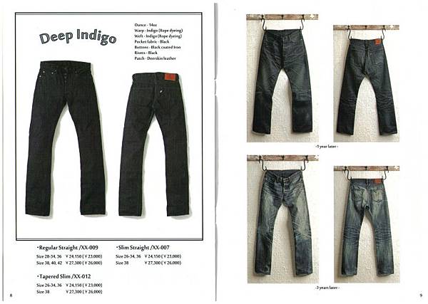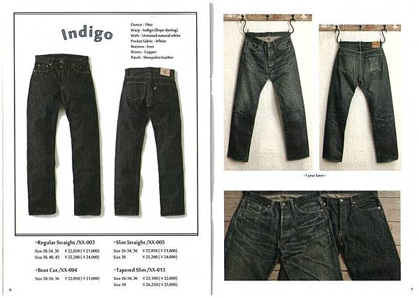 最常見的 INDIGO 布料,可說是每個養褲同好必備的基本樣式,p.b.j 也準備了多款褲型讓大家得以盡情挑選,從右圖的一年養成色落變化,也可以看出 p.b.j 強烈凹凸感布料的特質。
