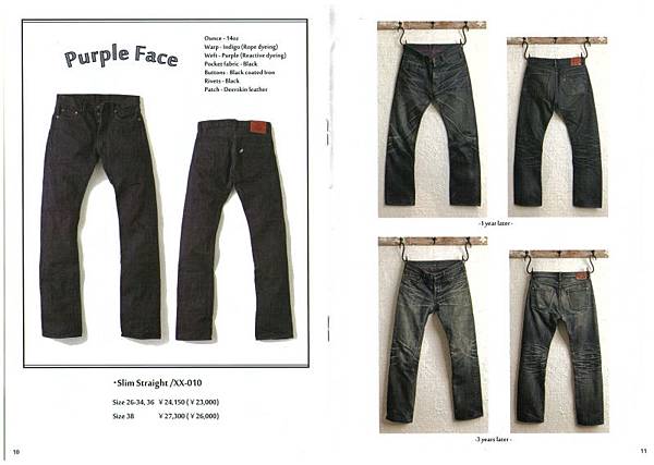 purple face 是 p.b.j 首度嘗試在布料正反面以不同染色的紗線製作,有別於一般牛仔褲(藍>淺藍>白)的顏色變化,紫色為底色的布料會帶來相當特別的養成變化。