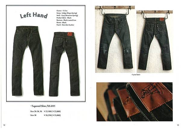 XX-011 是 p.b.j 旗下唯一一款採用13.5oz左綾布(LEFT WEAVING)料所製作的褲款,而版型也是最合身的 TAPERED SLIM,不論是布料縮水後的旋轉方向、還是養成後的變化,都會跟常見的右綾布(RIGHT WEAVING)大有不同。